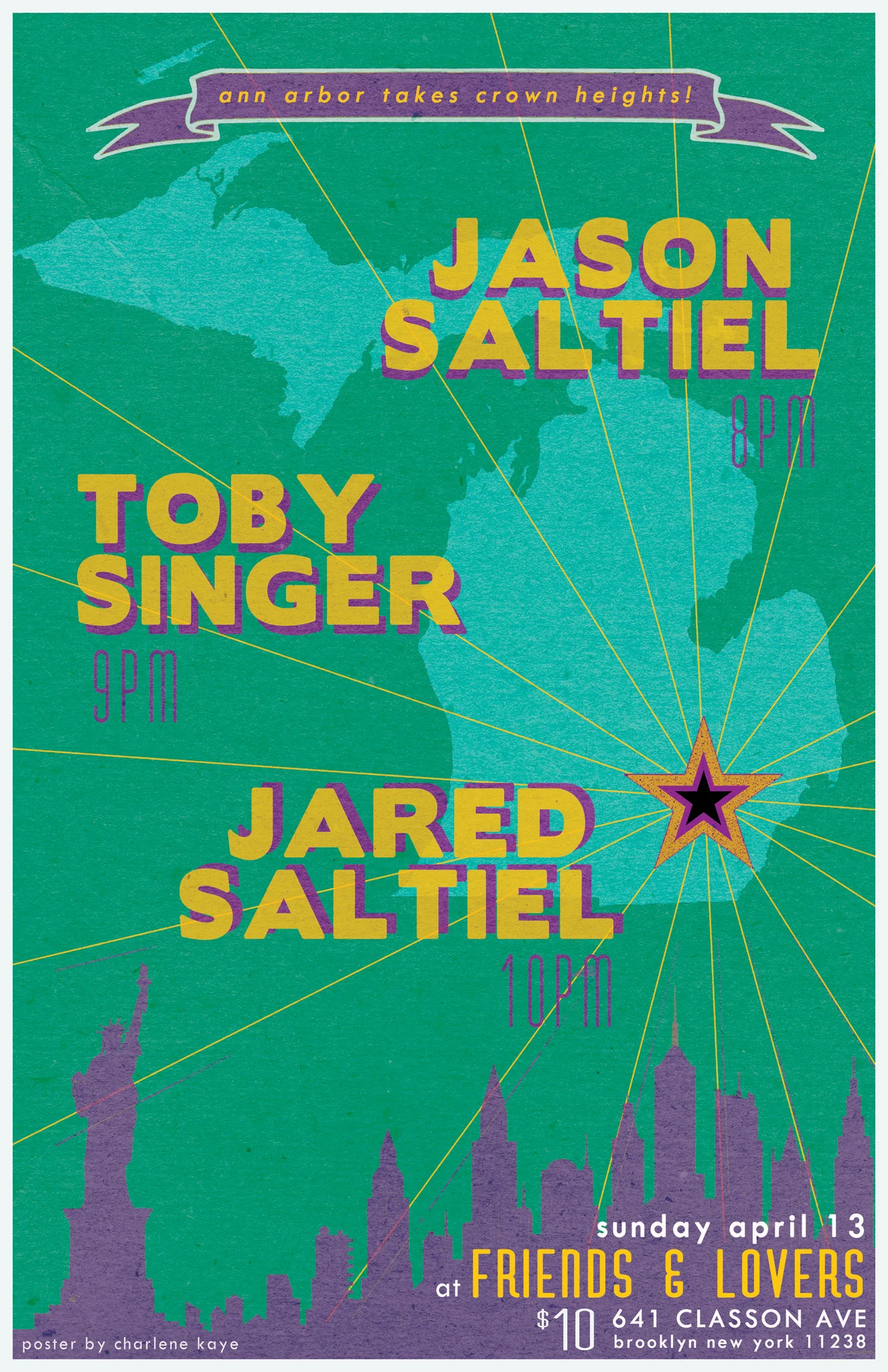 Created these gig posters for folk/rock musician Jared Saltiel by laying type over Liz Emirzian's beautiful illustrations. The lower poster is one I did a few years ago.